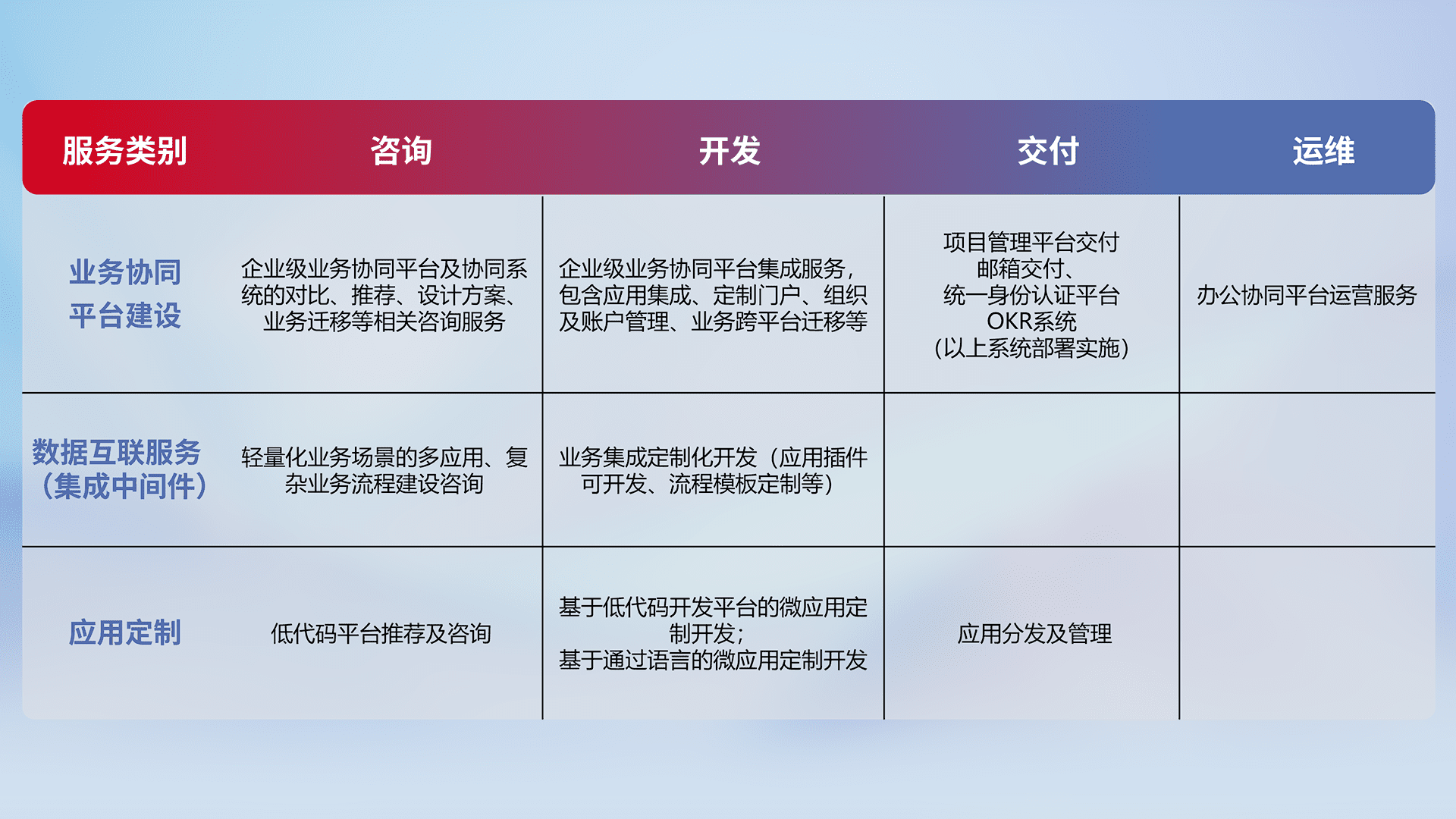 针对钉钉、、企微、、、、IDaas等平台级产品提供产品的规划、、、方案、、交付、、、定制化开发等服务,,实现如统一协同办公、、智能客户服务、、混合会议管理、、智能数据查询、、、等业务场景,,,实现数字化转型。。
