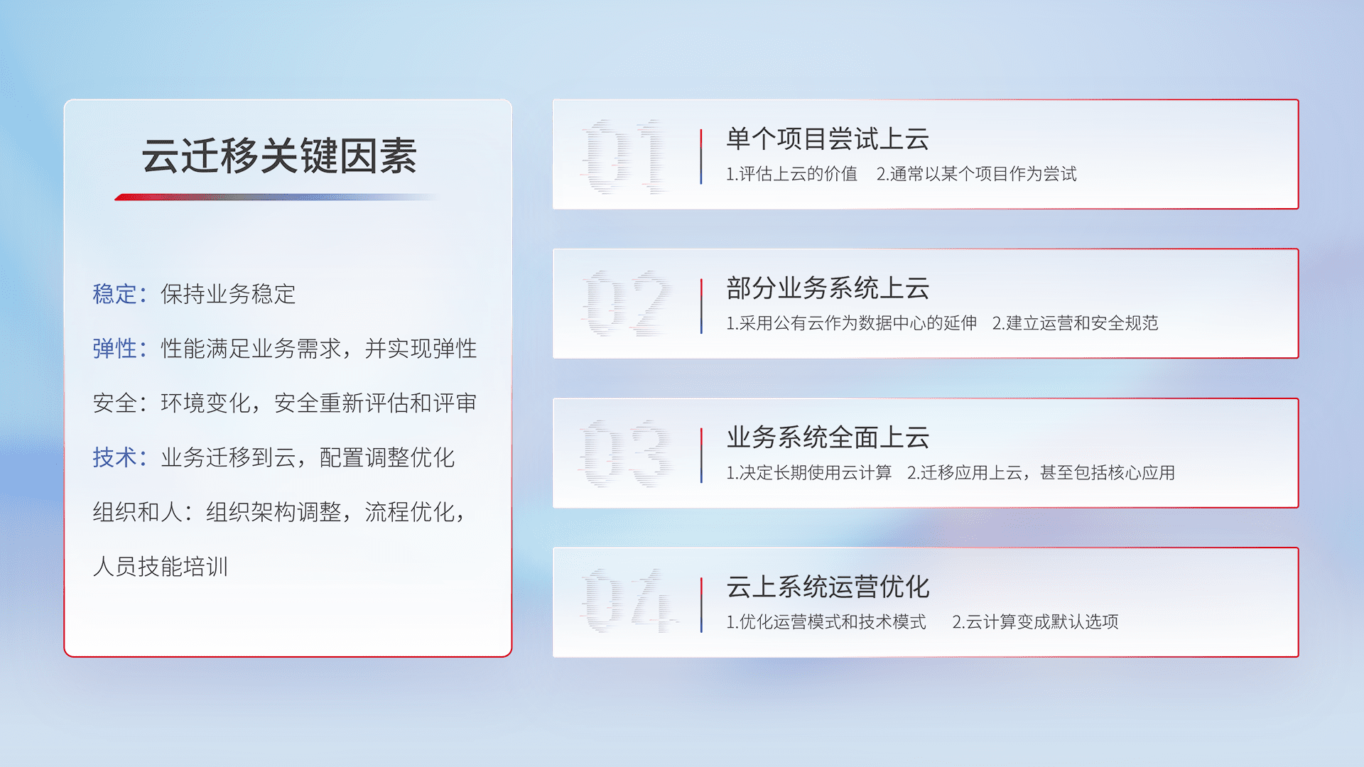 结合实际业务,,从规划设计、、云平台选型、、云原生改造、、数据迁移、、集成交付,,迁移全过程为客户识别最佳上云路径,,,做好风险识别管理,,,,设计网络架构、、、、身份权限、、、安全审计合规、、、、操作审计、、、日志审计、、监控告警策略、、、、多站点容灾设计等,,,,对云上基础设施进行整体规划,,提升IT治理水平,,,,以满足弹性、、、高可用、、、、高性能的需求。。。。
